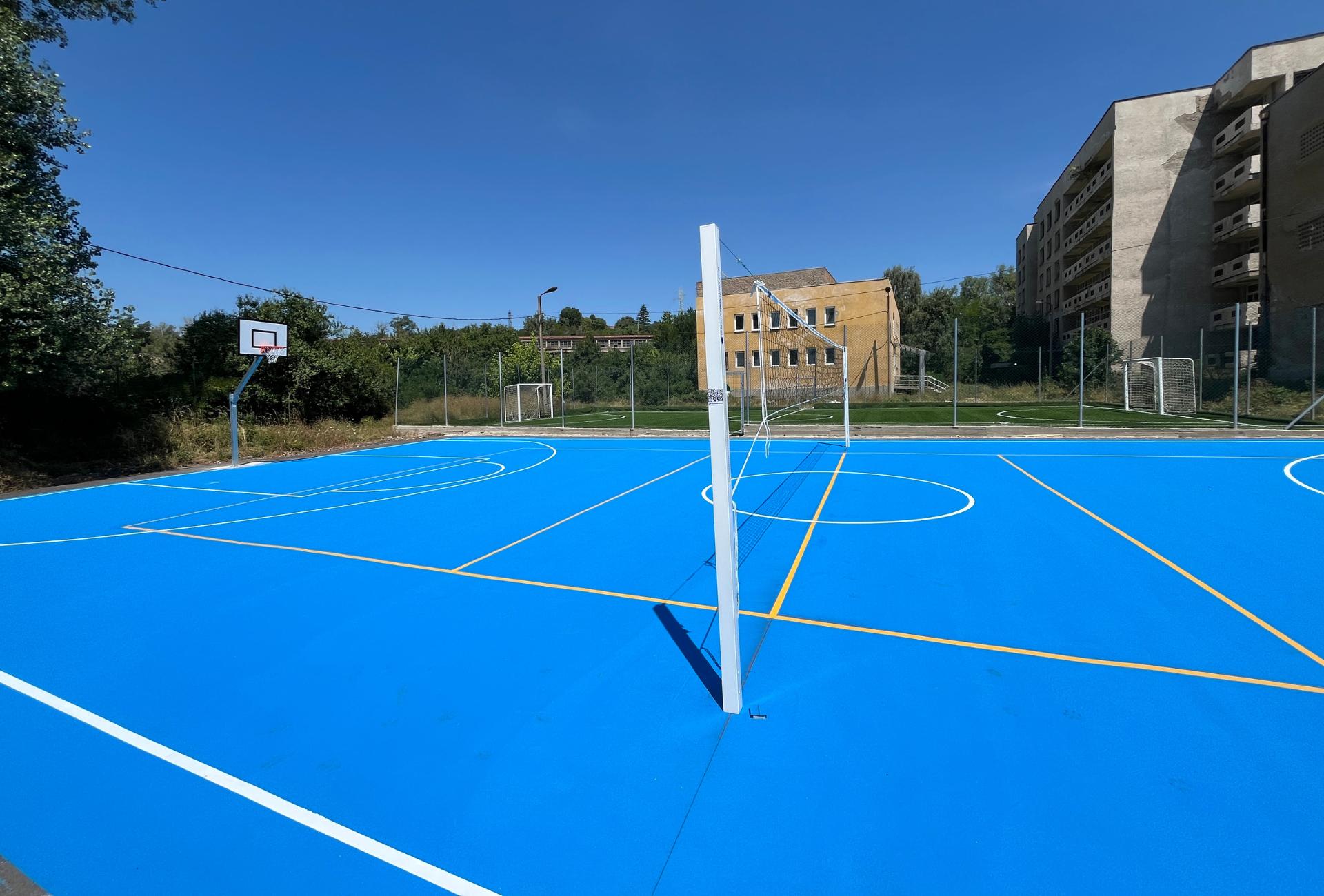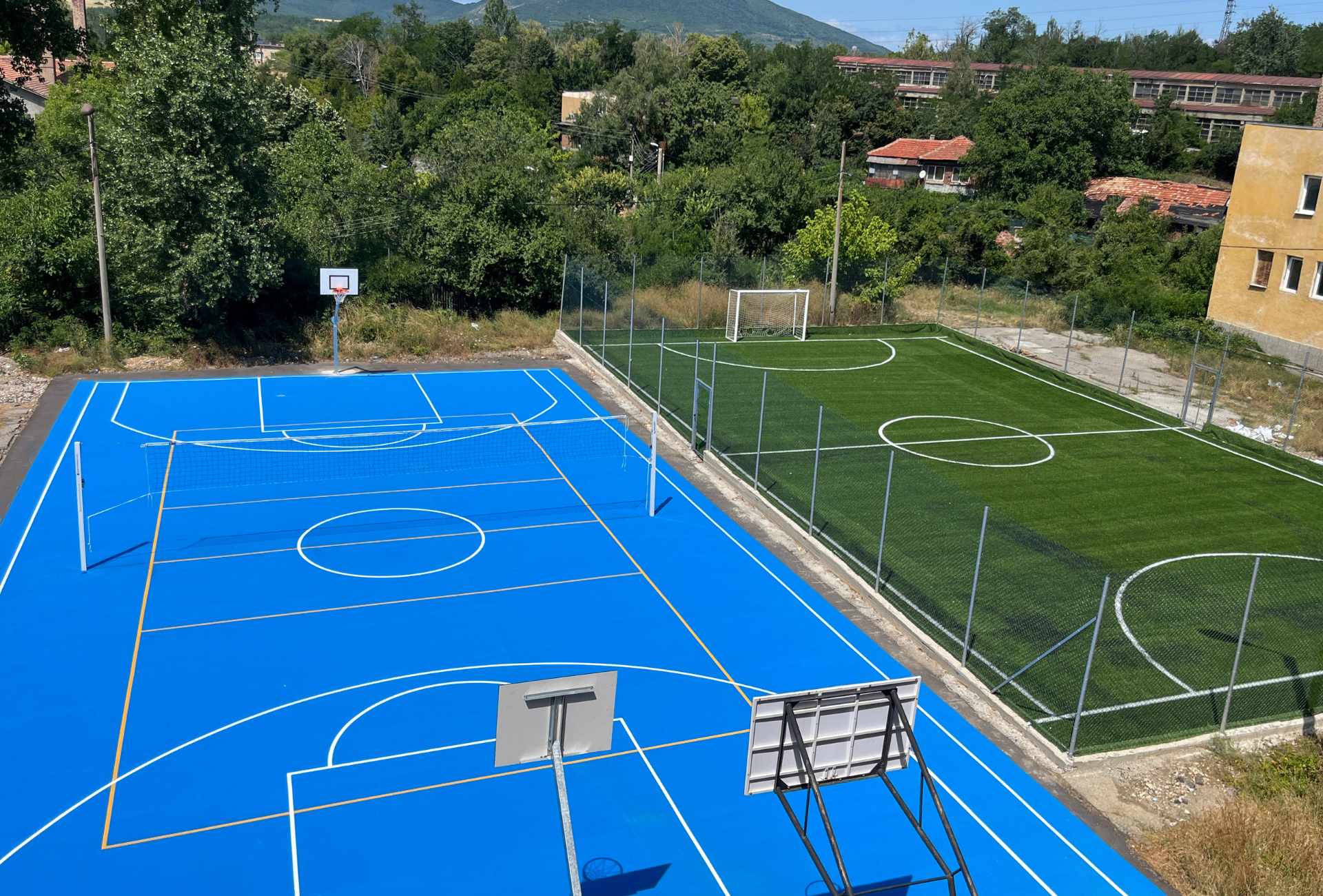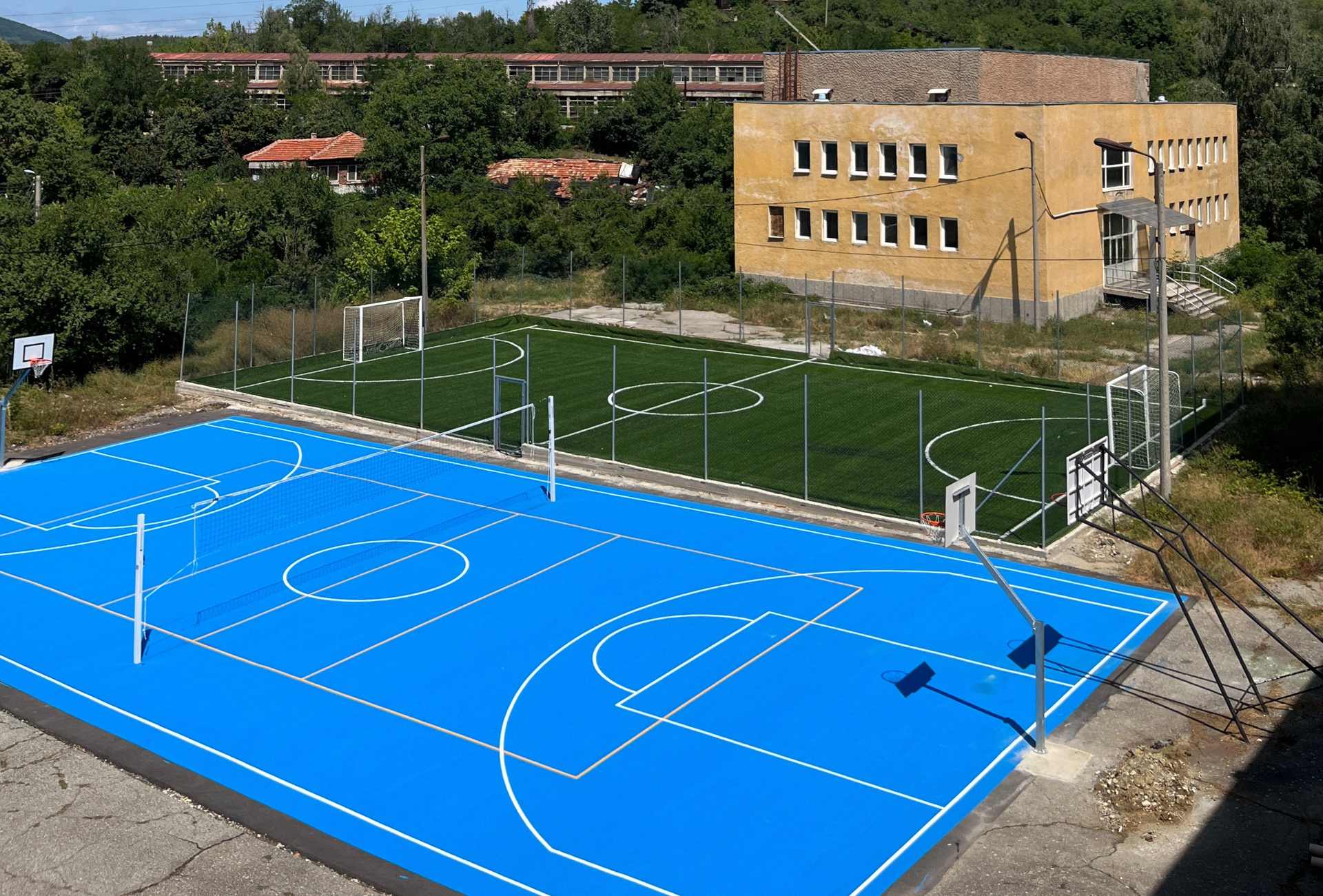 Местоположение: ПГ "Бобов дол", гр. Бобов Дол, България Дата на изграждане: Юли 2025 г. Вид настилка: Акрил, изкуствена трева Описание на проекта: Изграждане на футболен терен с изкуствена трева и комбинирано игрище за баскетбол и волейбол с акрилна настилка. Поставяне на защитна ограда за обезопасяване на игралното поле и спортно оборудване - баскетболни кошове и мрежа за волейбол.