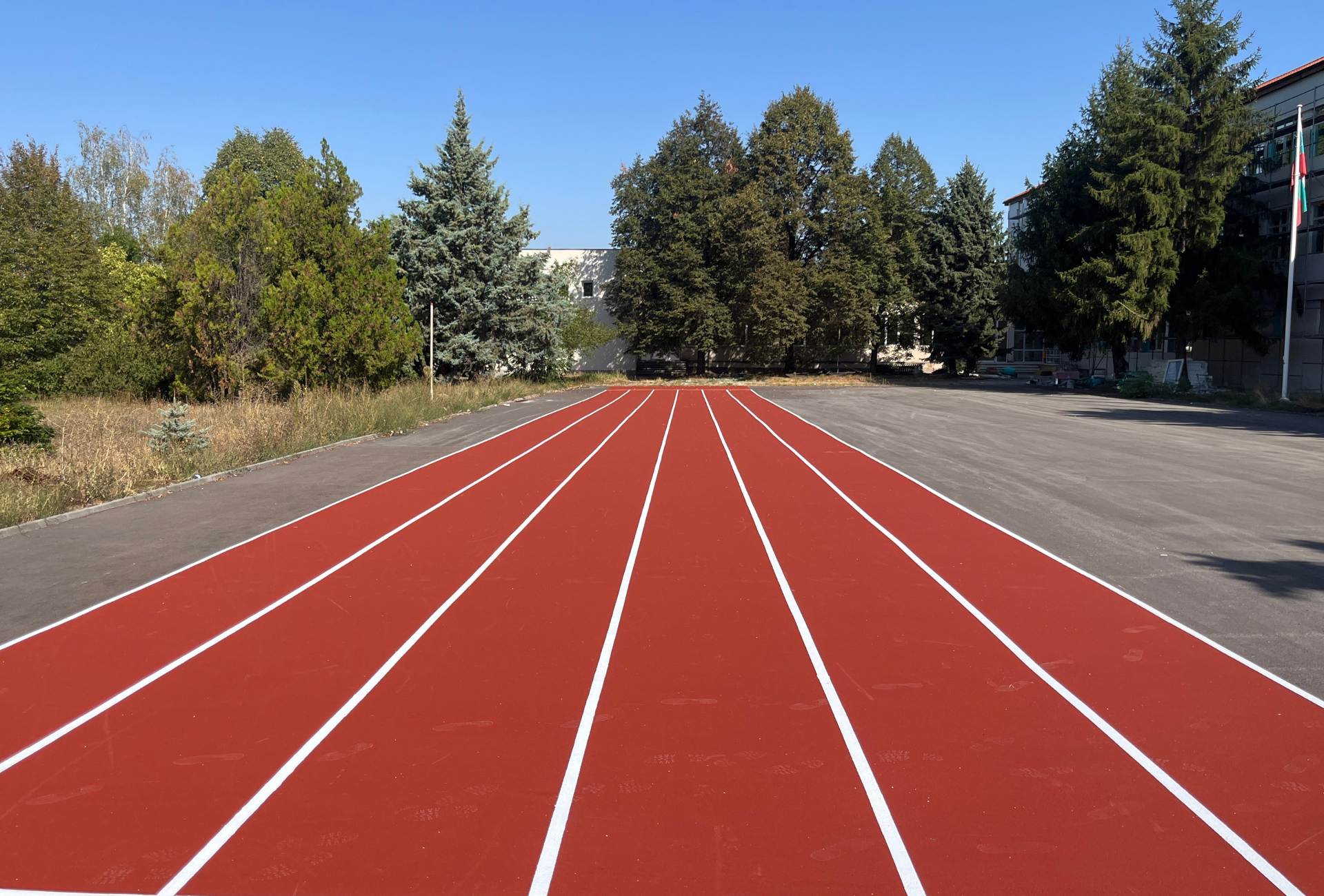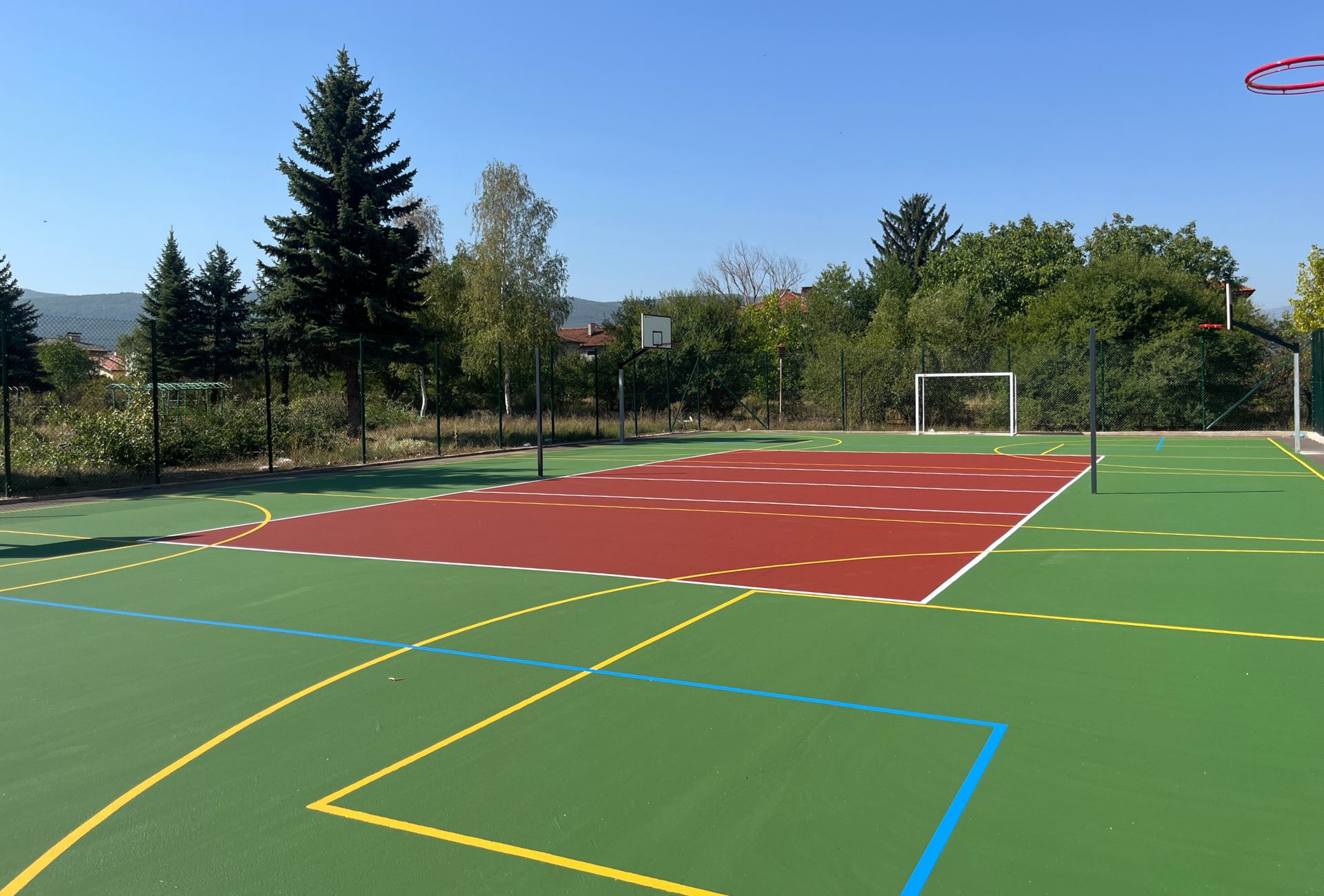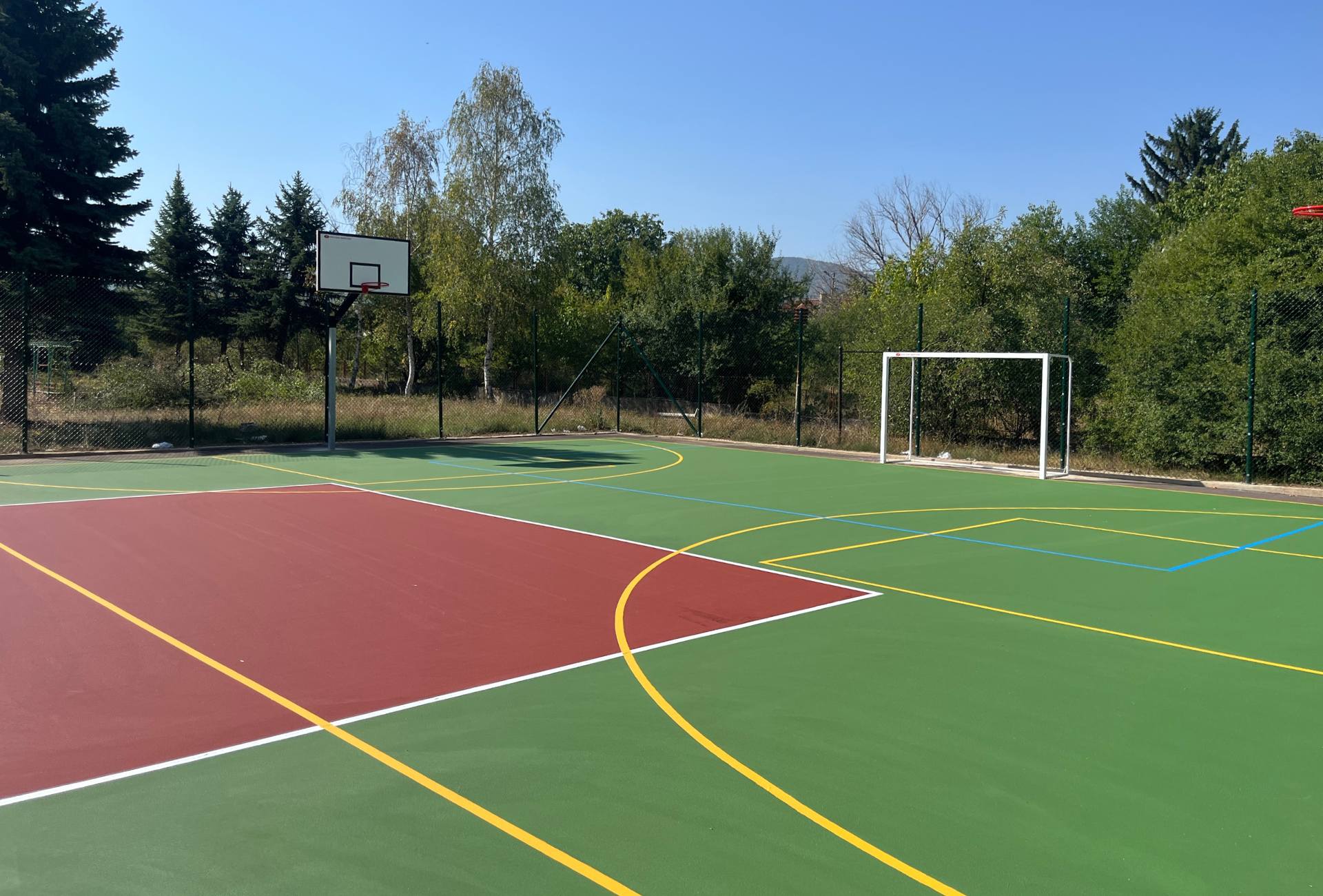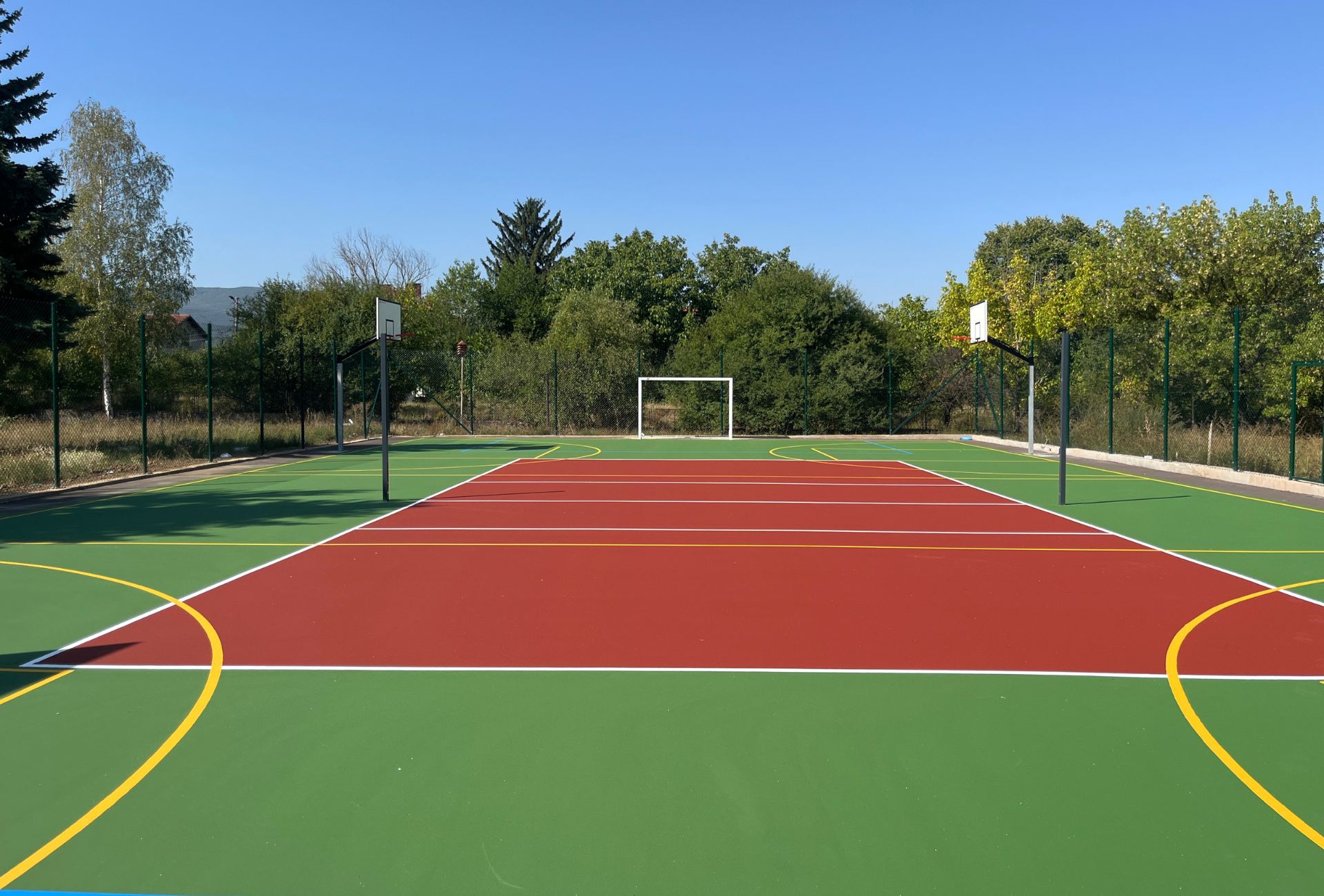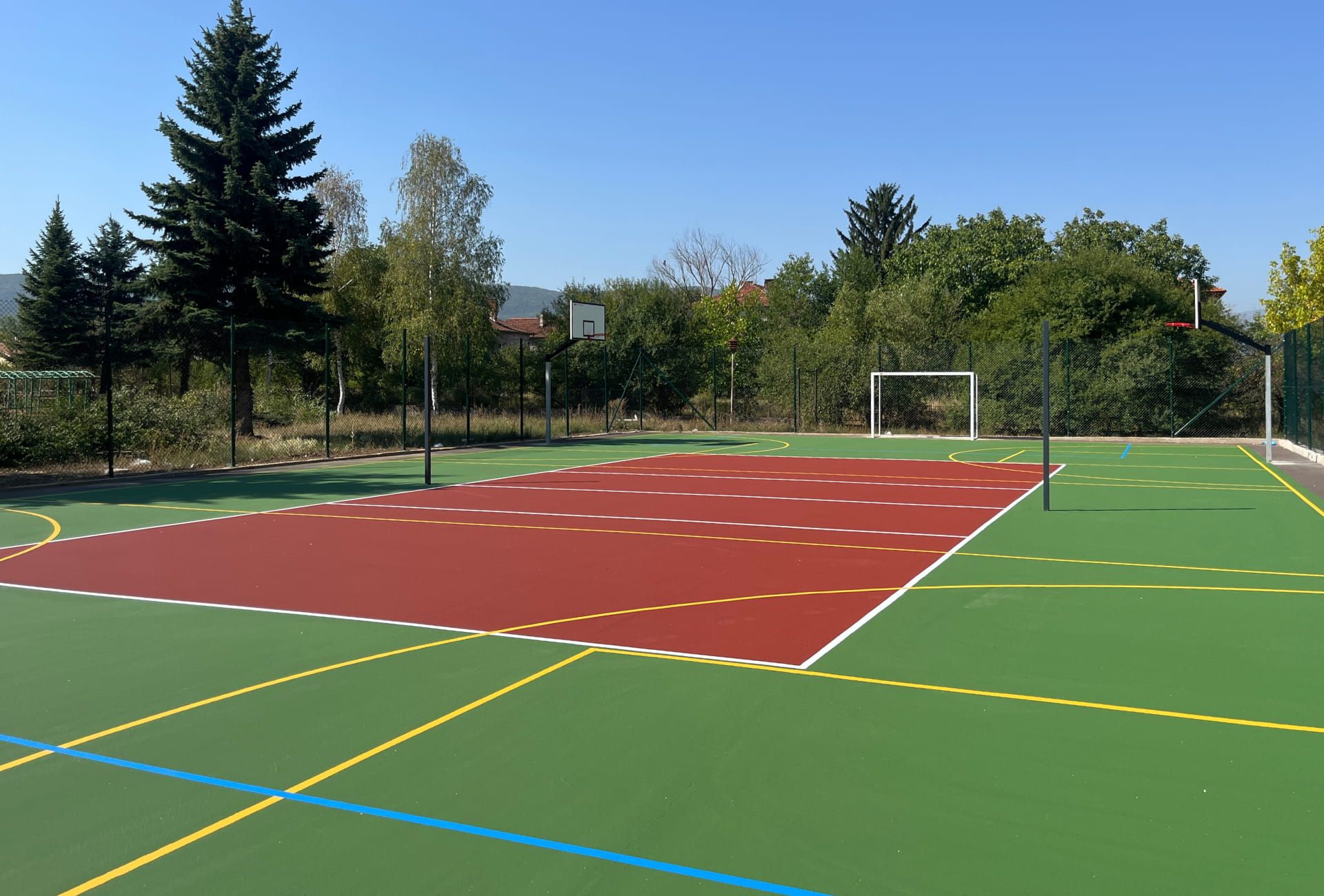 Местоположение: Професионална гимназия по керамика, с. Гара Елин Пелин, България Дата на изграждане: Септември 2025 г. Вид настилка: Акрил Описание на проекта: Изграждане на мултифункционално спортно игрище за волейбол, футбол и два баскетболни корта, и лекоатлетическа писта, подходяща за тренировки и състезания. Монтаж на оградна конструкция за обезопасяване на спортното пространство.