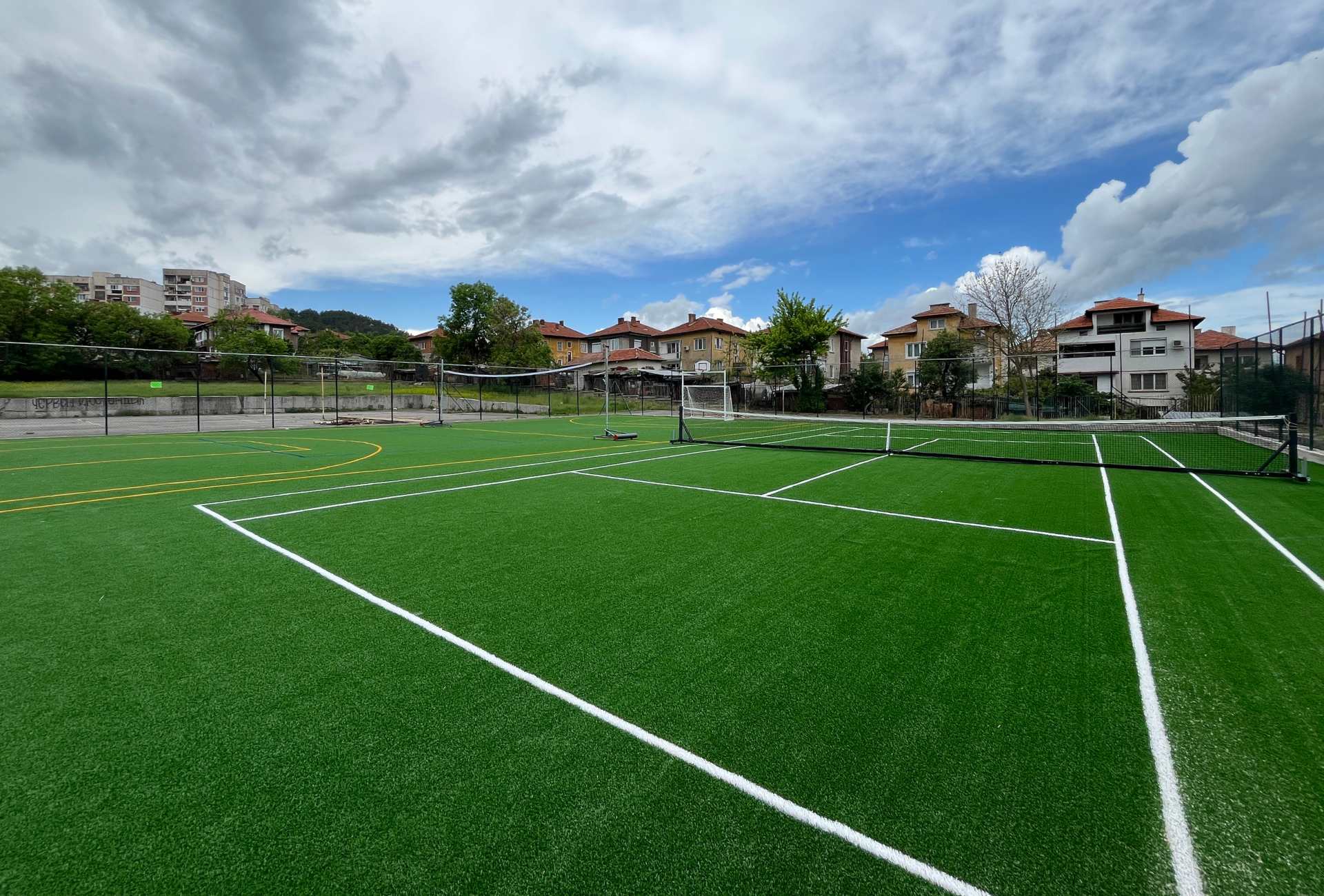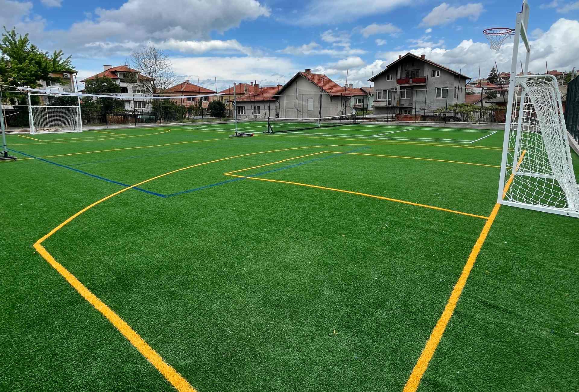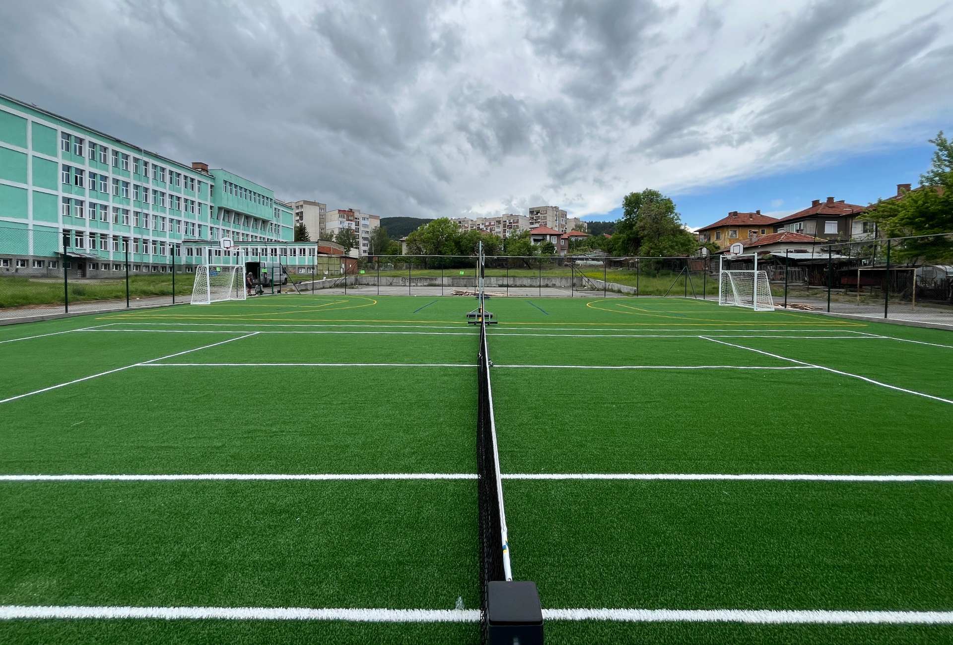 Местоположение: ПТГ "Джон Атанасов", гр. Кюстендил, България Дата на изграждане: Април 2025 г. Вид настилка: Изкуствена трева Описание на проекта: Изграждане на училищна спортна площадка с площ от 961 кв.м изкуствена трева за мултиспорт, с игрище за тенис и комбинирано игрище за футбол, волейбол и баскетбол. Доставка и монтаж на спортно оборудване - мултифункционални врати за футбол и баскетбол, както и колове и мрежи за тенис и волейбол. Поставяне на 125 л.м ограда.