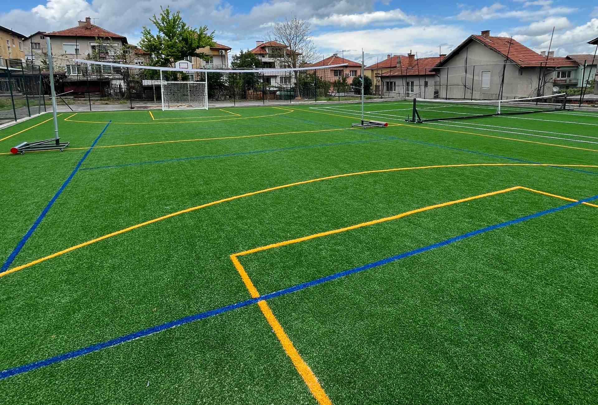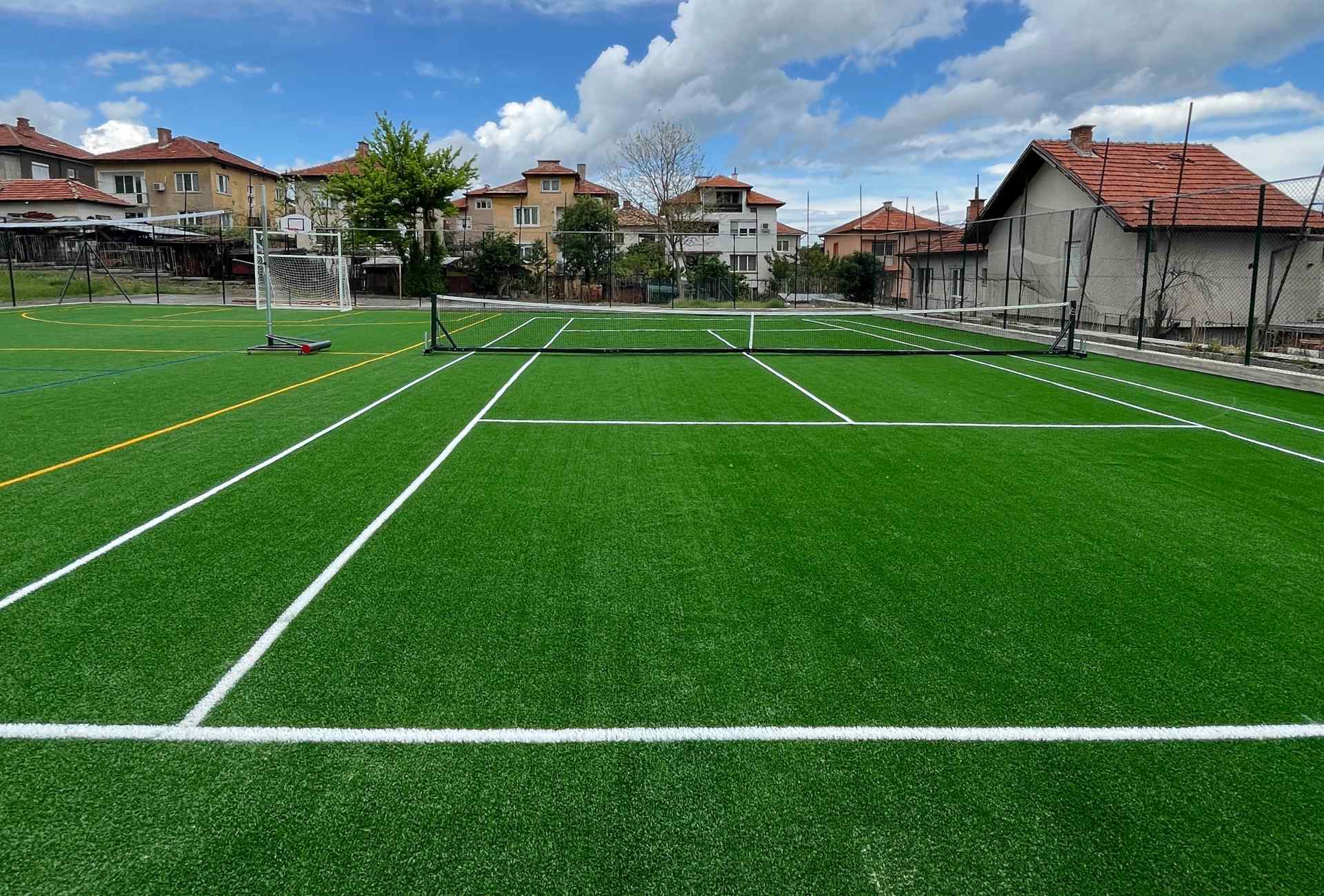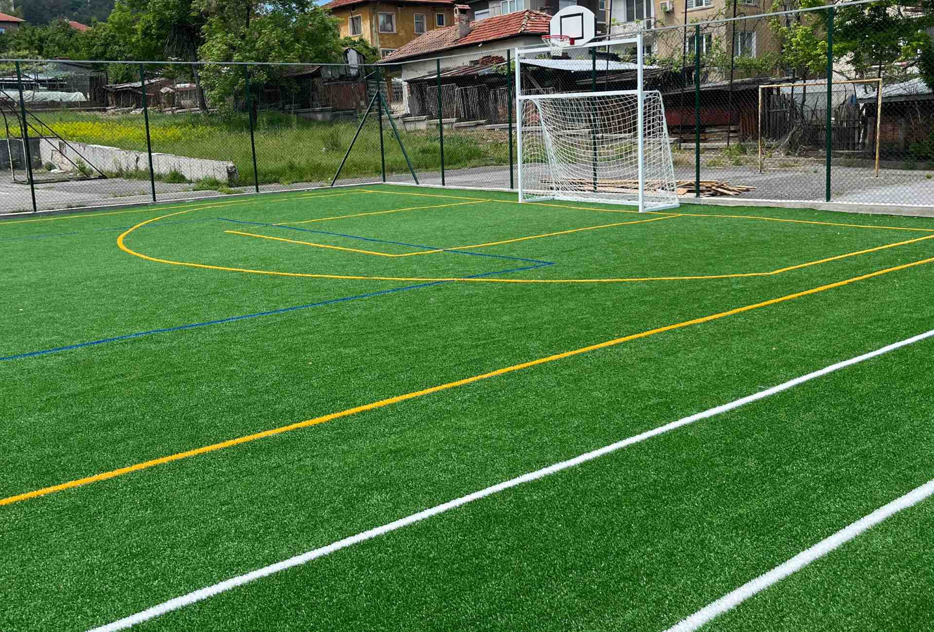 Местоположение: ПТГ "Джон Атанасов", гр. Кюстендил, България Дата на изграждане: Април 2025 г. Вид настилка: Изкуствена трева Описание на проекта: Изграждане на училищна спортна площадка с площ от 961 кв.м изкуствена трева за мултиспорт, с игрище за тенис и комбинирано игрище за футбол, волейбол и баскетбол. Доставка и монтаж на спортно оборудване - мултифункционални врати за футбол и баскетбол, както и колове и мрежи за тенис и волейбол. Поставяне на 125 л.м ограда.
